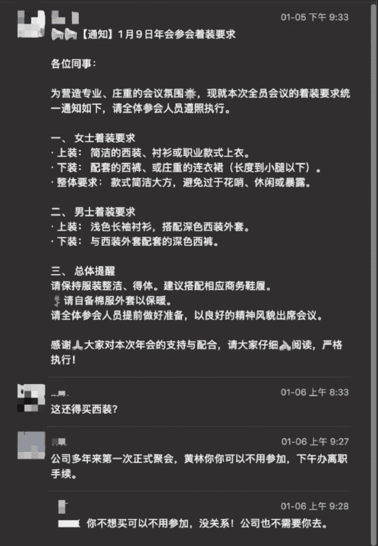 其中一名员工黄林提出质疑:“这还得买西装吗”,随后有工作人员回应称:“你可以不用参加,下午办离职手续”。